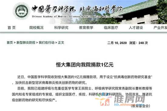 恒大集团1亿现金捐赠直指病毒"老巢"。捐赠对象中国医学科学院,与北京协和医学院院校一体,是中国的最高医学研究机构和最高医学教育机构,拥有23个研究院所、6家医院和7所学院。其中,中国医学科学院呼吸病学研究院由著名专家王辰院士、曹彬教授坐阵,领衔开展呼吸疾病防控领域流行病学、基础及临床研究。