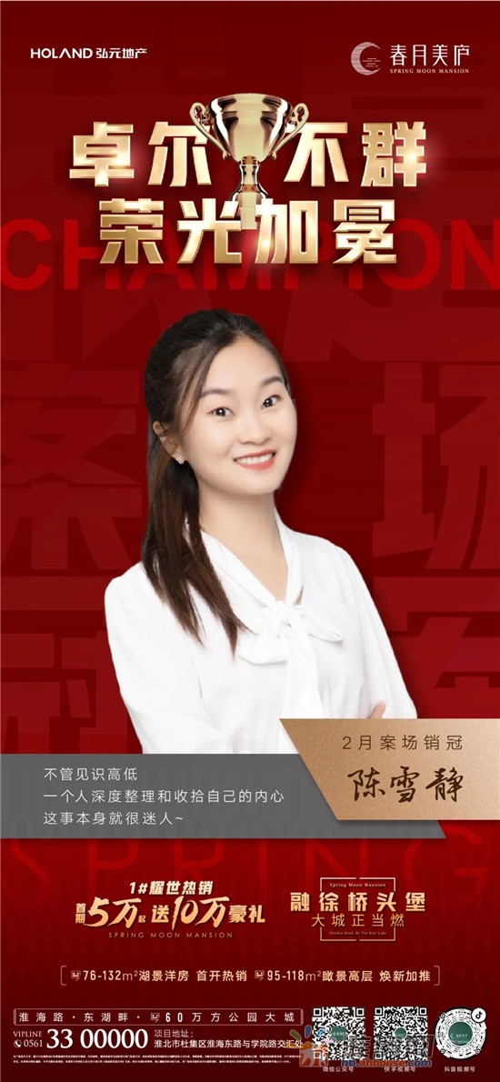 弘元·春月美庐2022年春节后的案场销冠重磅出炉,能够在2月短短的28天内就独领风骚势,必有着过人之处。所以我们本次的销冠采访也快马加鞭地完稿了,下面,让我们一起领略一下这位新登顶销冠的非凡风采吧~
