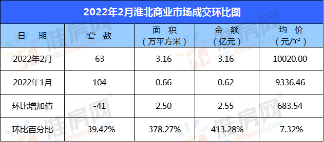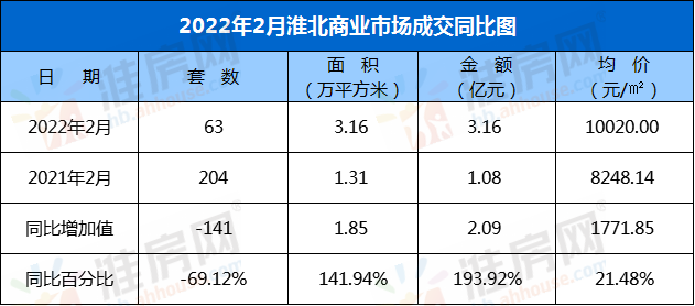 据星空地产研究院的数据显示,截止到2022年2月28日,淮北市区商业累计备案63套,环比减少41套,环比下跌39.42%;备案面积累计3.16万㎡,环比增加2.5万㎡,环比上涨378.27%;备案总金额备案累计3.16亿元,环比增加2.55亿元,环比上涨413.28%;均价10020元/㎡,环比每平米增加683.54元/㎡,环比上涨7.32%。