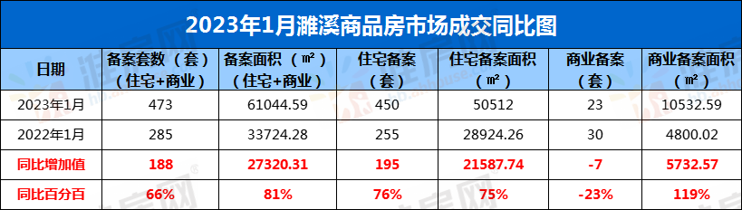 据淮北房地产交易网统计数据显示:2023年1月,濉溪县商品房备案472套,同比去年同期增加187套,同比上涨66%;备案面积60919.41㎡ ,同比去年同期增加27195.13㎡,同比上涨81%。