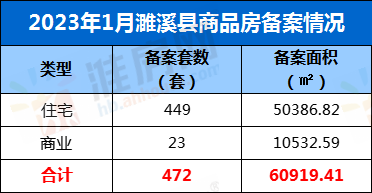 据淮北房地产交易网统计数据显示:2023年1月,濉溪县共备案472套房源,备案面积60919.41㎡。